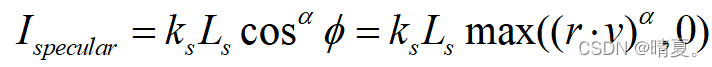 Phong提出了一个近似模型考虑镜面反射光部分,将表面看成是光滑的,观察者看到的光线强度取决于物体表面反射光的方向r和观察方向v这两者之间的夹角,用公式表示如下。