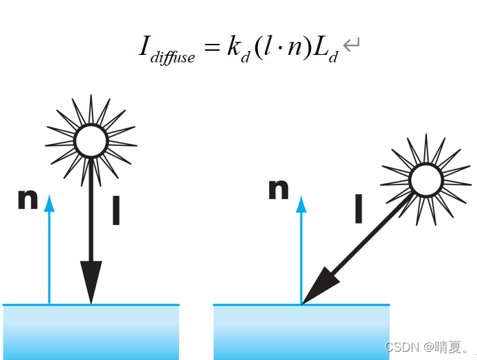 根据Lambert定理,只有入射光线的垂直分量才对照明起到作用,也就是说漫反射部分的光照效果与法向量n和光源向量l的夹角大小有关。如下图所示。同时考虑漫反射系数kd表示表面对漫反射光的反射程度。其中Ld代表漫反射光照的强度。