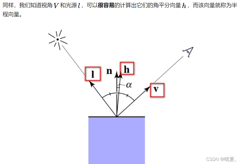 在镜面反射中,我们通过计算出射方向和视点的夹角来确定反射光的强度,在计算机中计算反射向量R的计算量比较大。因此我们可以用其他计算方法近似替代。