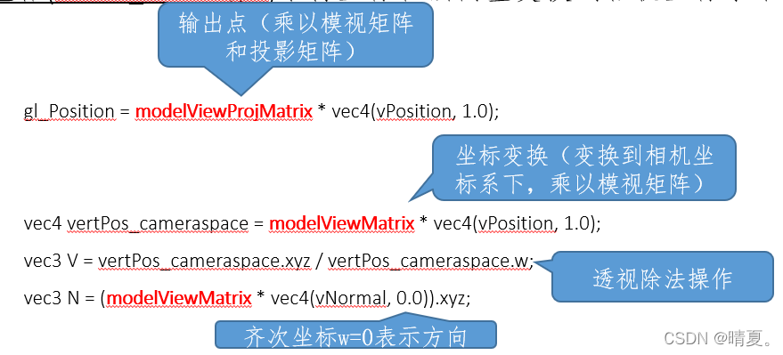 首先进行坐标变换,在顶点着色器中将坐标和法向量变换到相机坐标系下。