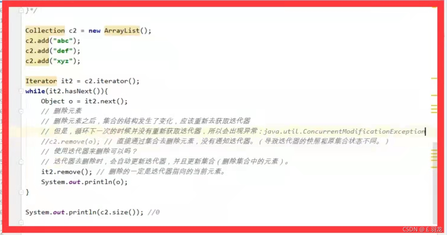 下图最重要的就是,你在while循环里调用集合自带的remove方法删除元素是不可取的,想在迭代时删除,可以,但你必须用我迭代器自己的remove方法。