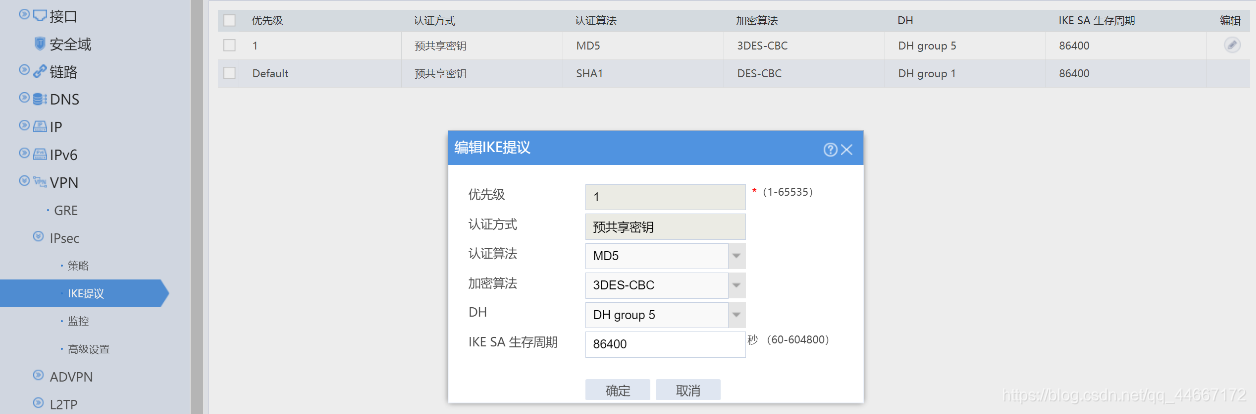 [F1000-AK115] ike proposal 1 [F1000-AK115-ike-proposal-1]authentication-method pre-share? ? ? ? ? ? ? ? //认证方式预共享加密 [F1000-AK115-ike-proposal-1]authentication-algorithm md5? ? ? ? ? ? ? ? ? ? ?//认证算法MD5 [F1000-AK115-ike-proposal-1]encryption-algorithm 3des-cbc? ? ? ? ? ? ? ? ? ? //加密算法3DES [F1000-AK115-ike-proposal-1]dh group5? ? ? ? ? ? ? ? ? ? ? ? ? ? ? ? ? ? ? ? ? ? ? ? ? ? //DH组5