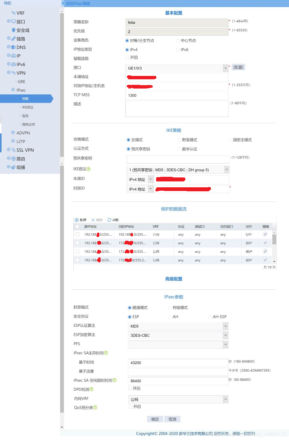 设备角色(分支/节点),使用一个IPSec策略feita应用于外网端口,设置优先级不同,代表不同的策略。