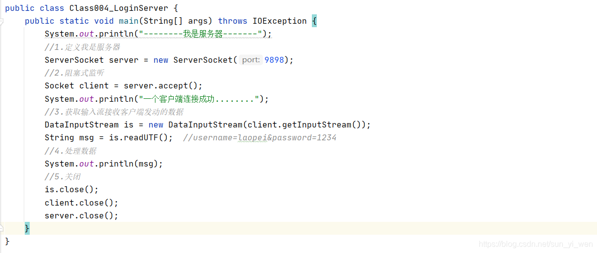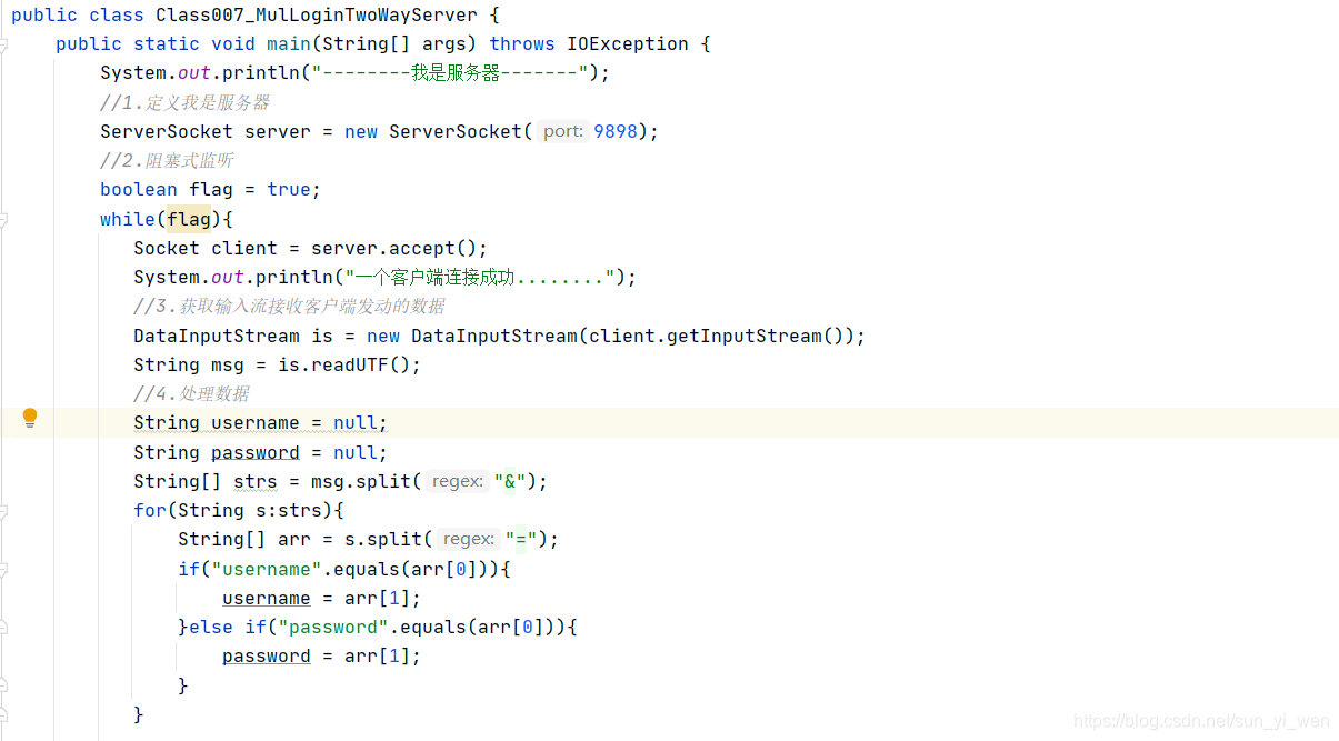 要求: 服务器端接收到用户输入的用户名与密码,与指定的laopei,1234比较是否相等,相等本地输出登录成功,不相等输出用户名或密码错误!!!
