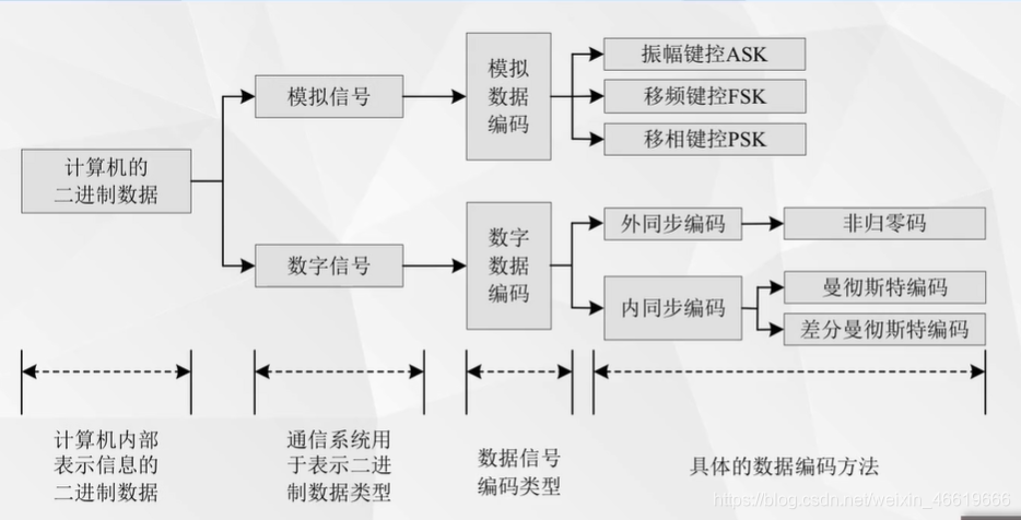 - 信息发送前要编码成数据,数据要用信号表示才能发送到对方。