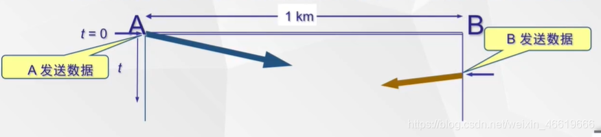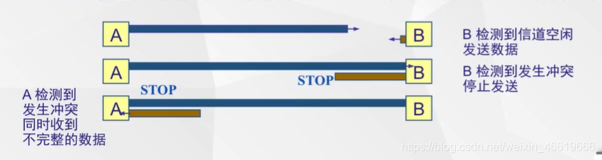 - B若在A发送的信息到达B之前发送自己的帧(因为这是B的载波监听检测不到A所发送的信息),则必然要在某个时间和A发送的帧发生碰撞