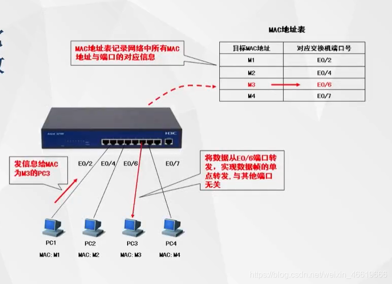 - 交换机收到一个数据帧后,能够识别出这个帧的结构,根据帧的目的地址,将这个帧转发到对应的某个端口上去,而不是播到其他所有的端口