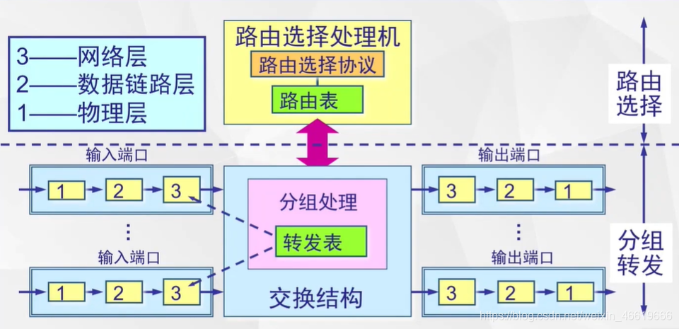 - 路由器具有多个输入端口和多个输出端口。其任务是转发IP数据报(分组)。将路由器某个输入端口接收到的分组,按照目的地,从路由器的某个输出端口转发给下一跳路由器。