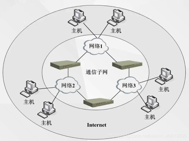 - 互联:指使用通信介质和网络设备将计算机互相连接起来,遵循共同的网络协议,实现通信