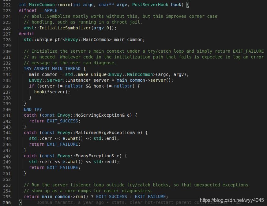 第234,235行代码一起实例化了一个server,255行代码启动该server,至此,envoy就启动起来了。