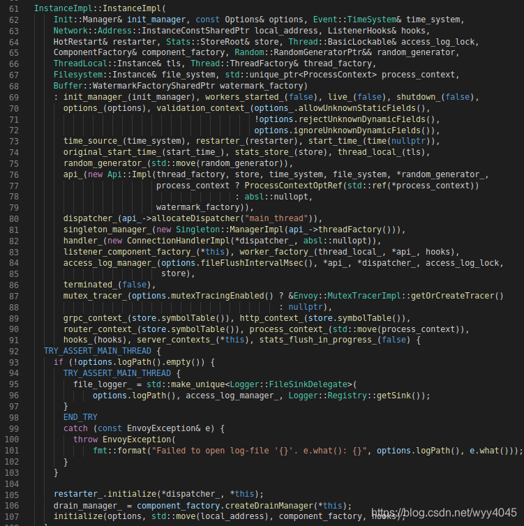 107行:Server::InstanceImpl构造函数调用initialize来创建服务器的其余组件,监听管理器ListenerManager和集群管理器ClusterManager也是在这里创建的。
