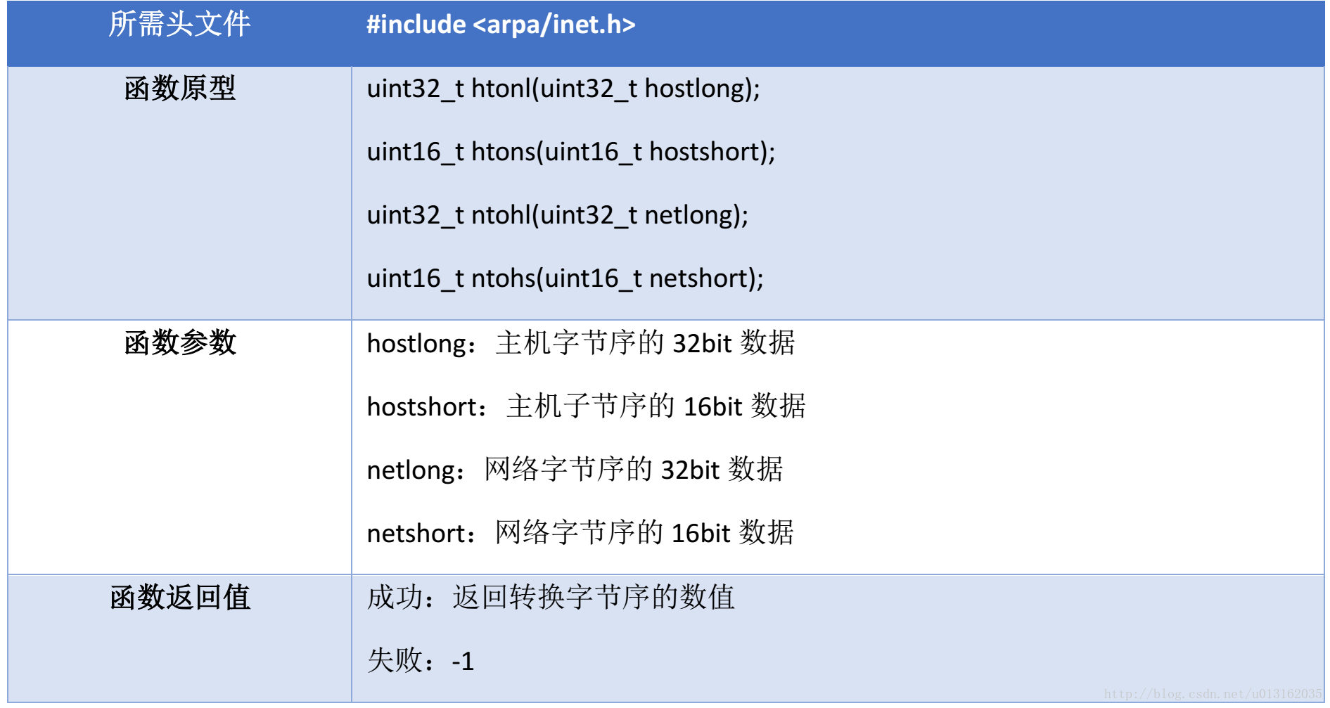 为什么需要字节序?在网络通信中,发送方和接收方有可能使用不同的字节序;  为了保证数据接受后能被正确的解析处理,统一规定:数据以高位字节优先顺序在网络上传输。因此数据在发送前和接收后都需要在主机字节序和网络字节序之间转换。  1)函数说明 字节序转换涉及4个函数:htons() 、ntohs() 、htonl() 和 ntohl() 。这里的 h 代表 host , n 代表 network , s 代表 short , l 代表 long 。通常 16bit 的IP端口号用前两个函数处理,而 IP 地址用后两个函数来转换。调用这些函数只是使其得到相应的字节序,用户不需要知道该系统的主机字节序和网络字节序是否真的相等。如果两个相同不需要转换的话,该系统的这些函数会定义成空宏。