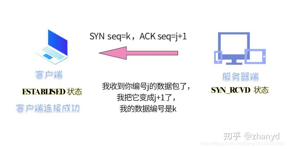 2.服务器端收到数据包后,返回一个SYN包设置seq=k,同时返回一个ACK的包设置seq=j+1,进入SYN_RCVD状态。(小美给小扎回信同意建立恋爱关系,小扎收到信后,确认他们之间的通信没有问题)