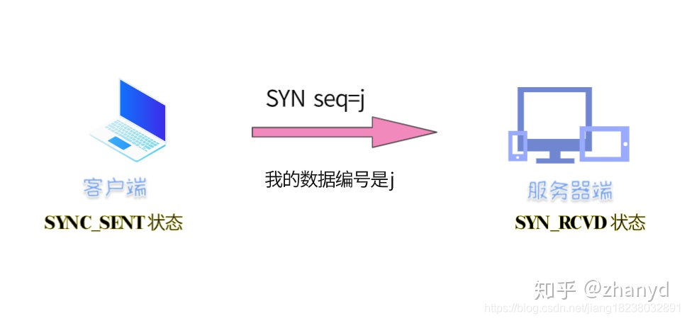 很多年以后计算机出现了,有一种叫做TCP的协议负责计算机之间的网络连接,客户端和服务器就想当年的小扎和小美一样开始通信了。1.客户端发送 SYN数据包,并设置seq序列号为j,客户端进入 SYNC_SENT 状态(小扎给小美写信表白)