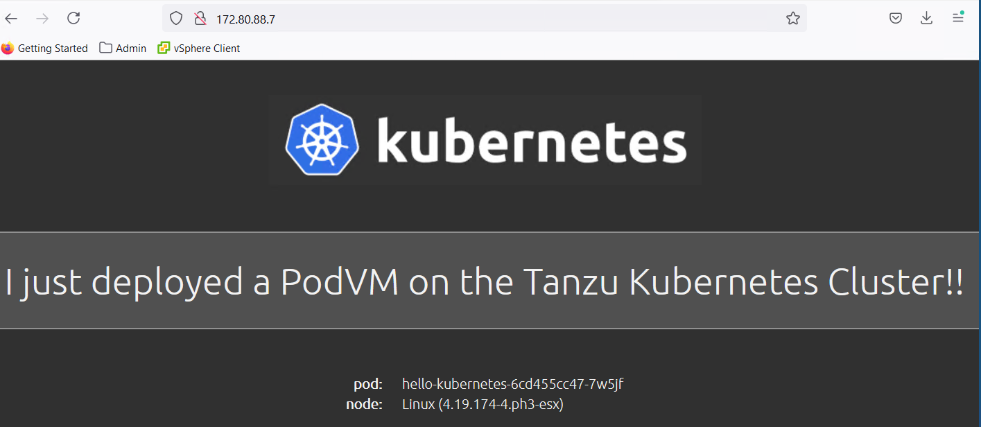 [root@hop ~]# kubectl get pod -owide NAME READY STATUS RESTARTS AGE IP NODE NOMINATED NODE READINESS GATES hello-kubernetes-6cd455cc47-7w5jf 1/1 Running 0 39d 10.96.4.4 tkg-cluster-01-workers-vqv9h-dfb456585-lqz4s hello-kubernetes-6cd455cc47-jw666 1/1 Running 0 39d 10.96.0.5 tkg-cluster-01-workers-vqv9h-dfb456585-mg2g7 hello-kubernetes-6cd455cc47-q7w4b 1/1 Running 0 39d 10.96.0.4 tkg-cluster-01-workers-vqv9h-dfb456585-mg2g7 hello-kubernetes-6cd455cc47-wm4lw 1/1 Running 0 37d 10.96.1.3 tkg-cluster-01-workers-vqv9h-dfb456585-8hmz8 test-pd 1/1 Running 0 27d 10.96.0.6 tkg-cluster-01-workers-vqv9h-dfb456585-mg2g7