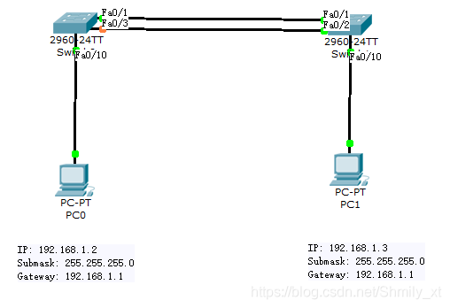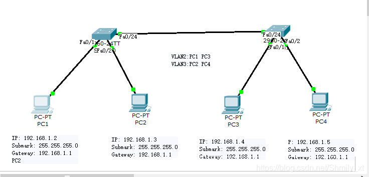 两台交换机之间需要配置trunk才能实现不同交换机下的同一个vlan互相访问。