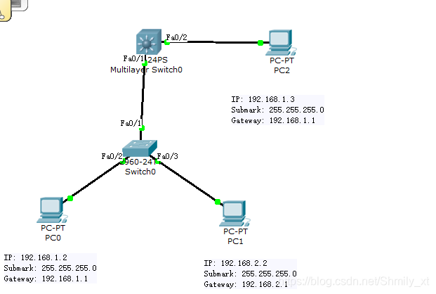 int range fa 0/1 - 2 #同时打开1号和2号端口,记得加range参数 ?对0/1 0/2进行配置 switchport mode trunk #变成trunk模式,让多个vlan可以通讯 exit spanning-tree mode rapid-pvst ?#定义为生成树协议