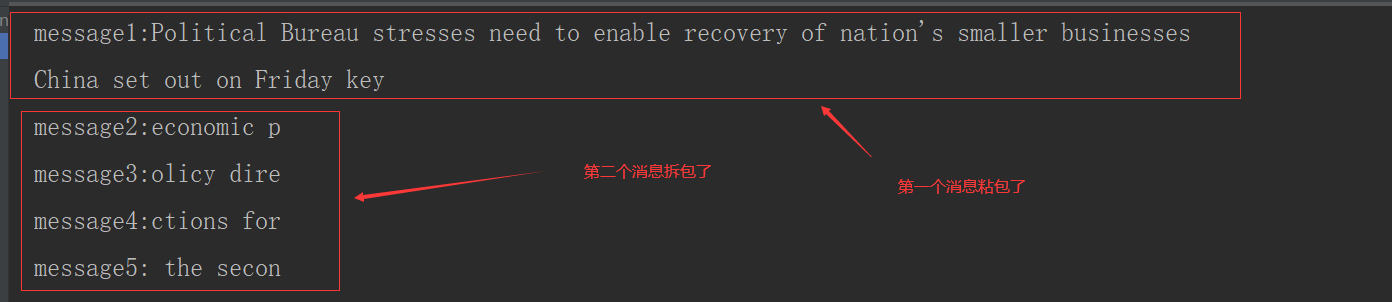测试  控制台:  这里很直观的看到粘包和拆包的结果,当然这里小编设置了发送的缓存区和发送的大小。那假如消息出现这样的情况,那我们怎么来解决粘包和拆包的问题呢。