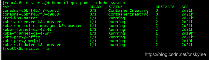 查询pods的状态时,发现coredns的两个pods实例一直处于容器创建(ContainerCreating)状态,而flannel容器实例运行正常。如下图所示: