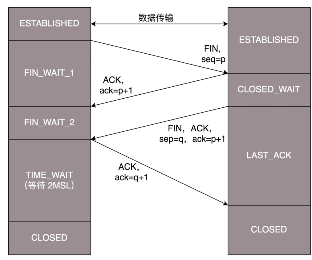 第一次:(A) –> [FIN/ACK] –> (B) 客户端A没有要发送给服务端B的数据了,想要关闭链接,则发送一个FIN=1,ACK=1的包,告诉B可以关闭连接了,我没有什么数据要给你了。A会进入FIN_WAIT_1状态 第二次:(A) <– [ACK] <– (B) 然后B会发送ACK=1的包给A,告诉A我知道你没有什么想给我的了,但是我还有数据要给你,你先等下,我先不想FINISH呢。这时A会从FIN_WAIT_1变成FIN_WAIT_2状态。一直等待,如果这时候B跑路了,那A将永远停留在这个状态下。 第三次:(A) <– [FIN/ACK] <– (B) 等B把数据都发送给A之后,B会再次发送一个包,这次FIN=1,表示我这边也想关闭了,咱俩一起关把。在2和3之间,可能还会有很多B->A的传递,ack均为80001。 第四次:(A) –> [ACK] –> (B) 然后A回应一个ACK,表示我知道了,一起关吧。B收到这个ACK后,就会CLOSE。但是实际上A不会直接CLOSE,还会进入一个等待时间状态TIME_WAIT,持续2倍的MSL(Maximum Segment Lifetime,报文段在网络上能存活的最大时间)。过了这个状态,才会CLOSE。 第四次时,A客户端不能直接断开。原因在于如果A断开了访问,但是B之前丢失在路上包又到达A了,碰巧A已经删掉了这次连接,并且把这个端口赋给了新的应用。那这个请求是不是就到达了新的应用了而产生了错误?所以必须等到B的重复包一定死在了路上,A才能放心的断开连接。