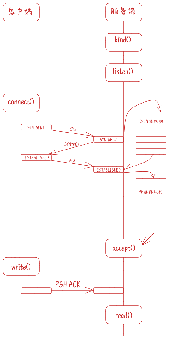 服务端收到客户端发起的 SYN 请求后,内核会把该连接存储到半连接队列,并向客户端响应 SYN+ACK,接着客户端会返回 ACK,服务端收到第三次握手的 ACK 后,内核会把连接从半连接队列移除,然后创建新的完全的连接,并将其添加到 accept 队列,等待进程调用 accept 函数时把连接取出来。