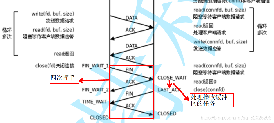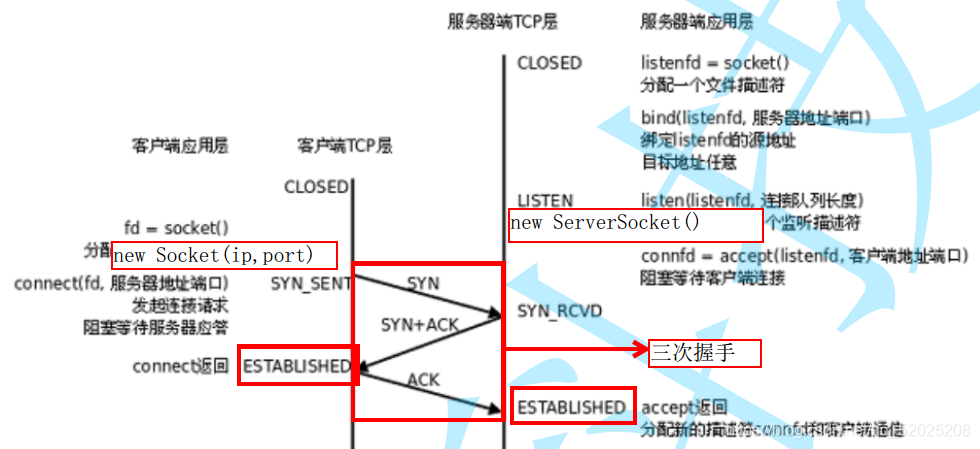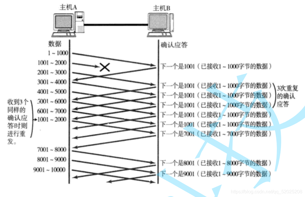七、TCP/IP 1.传输层: (1)端口号:找到应用程序 最大端口号:0-65535 端口号分类: 知名端口号 0-1023(FTP:21,SSH:22,Telnet:23,HTTP:80,HTTPS:443,MySQL:3306,tomcat:8080) 动态端口号:1024-65535 八、TCP特性 1.确认应答(ACK)机制(保障 TCP 稳定的核心机制) 2.超时重传机制 超时重发的策略: 策略1:发送不会以固定的频率发送。策略1采取的是悲观策略,如果第一次发送消息失败了,那么大概率第二次也会失败,所以TCP会以指数级超时时间增长的频率去发送消息。 策略2:如果经历了一定的重试次数,消息还没有得到应答,就会停止发送。 3.连接管理机制 3次握手(3次通讯) 4次挥手(4次通讯)  ESTABLISHED:表示3次握手已经完成,可以进行数据的传输了。  服务器端先变为CLOSED状态,客户端的TIME_WAIT会等待 2 MSL(最大超时时间)状态才会变为CLOSED。 2 MSL = ACK 最大超时时间(1 MSL) + 对方发送给它消息的一个最大等待时间(1 MSL)。 4.滑动窗口 一发一收的方式性能较低, 那么我们一次发送多条数据, 就可以大大的提高性能。  如果出现了丢包, 如何进行重传? 这里分两种情况讨论. 情况一: 数据包已经抵达, ACK被丢了。  这种情况下, 部分ACK丢了并不要紧, 因为可以通过后续的ACK进行确认。 ACK=6000 的含义:告诉主机A,我成功的收到了 0~6001 ACK返回的值是当前(主机B_右边)接收缓冲区的下一个值(最大连续值) 情况二: 数据包就直接丢了。  当前面的数据被正常补齐之后,返回的ACK是最大值,这种机制叫做“快重传”。 面试问题 1.TCP,UDP的区别: UDP:无连接,不稳定,面向数据报 ; 没有发送缓冲区,只有接收缓冲区。 TCP:有连接,稳定,面向数据流; 既有发送缓冲区,又有接收缓冲区。 2.UDP 一个包的最大理论长度=2的16次方 = 65536/1024=64KB,如果 UDP 编程的时候的数据大小大于64KB会怎摸样? (1)在 应用层进行数据包的拆分和组合。 (2)大于64KB不用处理,交给TCP/IP协议去处理,它会在网络层进行分包和组包(缺点:一个包丢失整组包舍弃)。 3.两次握手可不可以? 不可以,不能证明客户端的接受能力和服务器端的发送能力。  4.三次挥手可以吗? 有可能可以。 对应到程序:接收缓冲区没有数据了,那么就可以直接关闭连接。 5.如果发现服务器端存在大量的CLOSED_WAIT 说明程序有问题? 服务器没有正确的关闭 socket, 导致四次挥手没有正确完成. 这是一个 BUG. 只需要加上对应的 close 即可解决问题