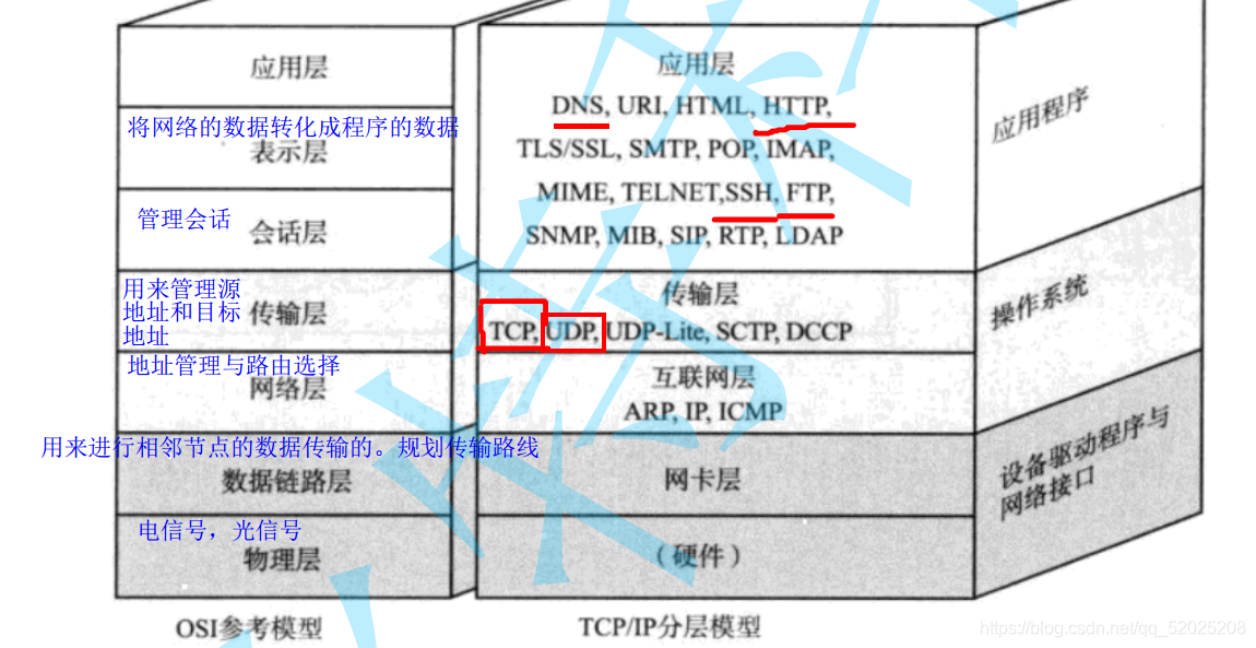 一、网络分层协议: -OSI 七层协议 -TCP/IP 四(五)层协议  1.数据传输过程的5要素:(1)目标地址IP (2)目标端口 (3)源地址IP (4)源端口号 (5)协议类型 2、传输层:TCP/UDP UDP:无连接,不稳定,面向数据报 Datagram TCP(主流):有连接,稳定,面向数据流(应用层协议中的HTTP协议就是基于TCP/IP协议实现的) 3.数据传输过程(封装、分用) 封装:从应用层到物理层的过程 分用:从物理层到应用层的过程  二、网络中的地址管理 1、IP(IPV4/IPV6) (1)查看本机的IP:cmd -> ipconfig  IPV4:32位数值(0/1)组成 2.MAC:物理地址、网卡地址 cmd -> ipconfig /all  三、UDP编程 例:智能机器人