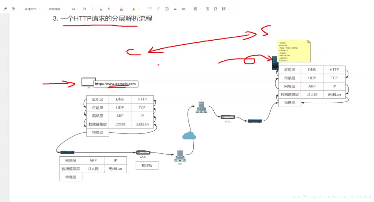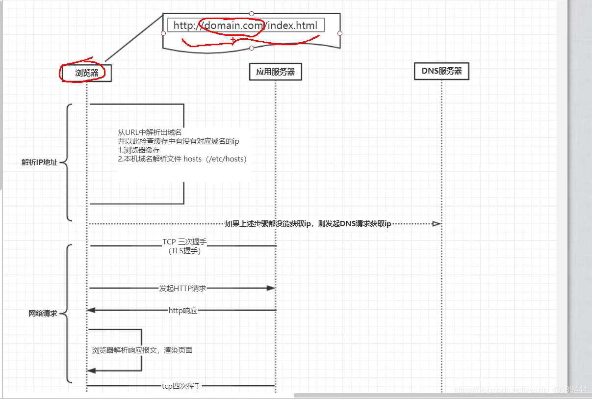 输入地址并确认后,浏览器对域名进行访问,浏览器对域名进行解析,如果浏览器有域名对应的DNS相关信息的缓存,有的话可以拿到服务端的IP地址,如果没有的话,会去本地的host文件查看是否进行了配置,如果host文件没有配置相关的信息,那么就会发起DNS的请求用来获取对应的服务器的IP地址。应用端会构造DNS的请求报文,应用层会调用传输层的UDP的相关协议进行数据传输,会在DNS的基础上加上UDP的请求头然后传输信息至网络层,网络层会在UDP的请求报文基础上加上IP的请求头然后到数据链路层,数据链路层会实现二层寻址,会加上自己的mac信息和通过网络层的ARP协议里拿到的下一步基地的mac信息一起通过物理层一起传输出去,通常传到路由器,然后路由器这个三层设备最终会通过运营商的路线传输到下一个路由器地址,达到服务器后信息通过相同步骤进行层层解析HTTP的请求报文,然后构造HTTP响应报文沿着相同的步骤传输至客户端