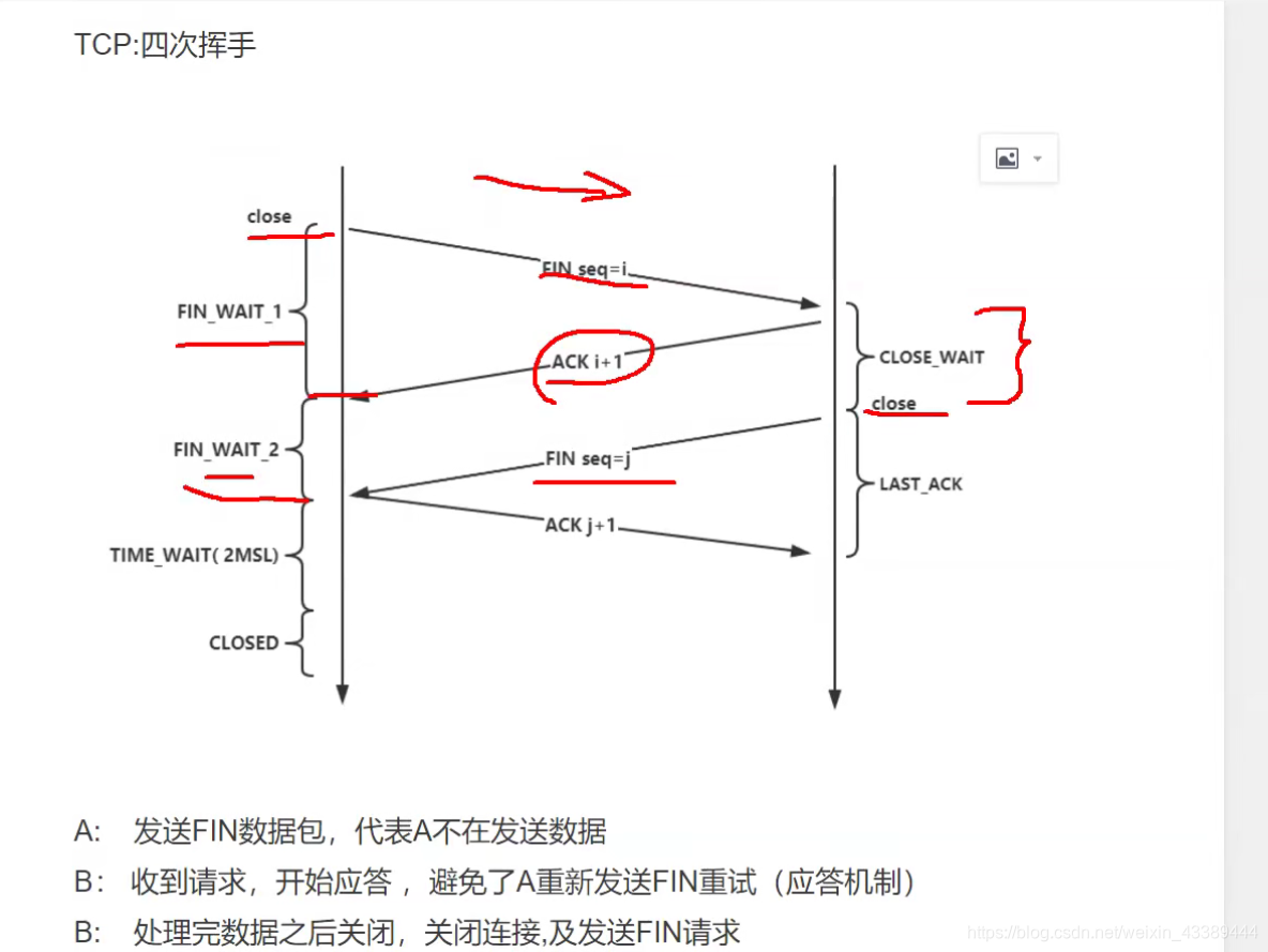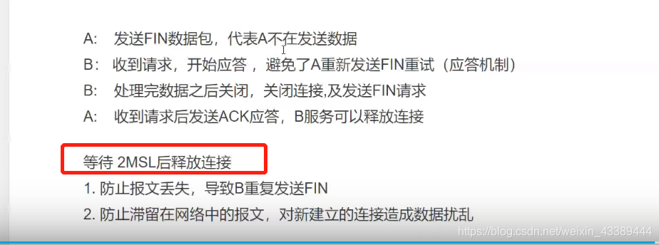 四次握手机制也是由客户端去发起,客户端会发送一个报文,在报文里面FIN位标志位置一,当服务端收到这个报文之后,我就知道了客户端想要和我断开连接,但是此时服务端不一定能做好准备,因为当客户端发起断开连接的这个消息的时候,对于服务端而言,他和还有可能有未发送完的消息,他还要继续发送,所以呢,此时对于服务端而言,我只能进行一个消息确认,就是我先告诉服务端,我知道你要给我断开连接了,但是我这里边还可能没有做好准备,你需要等我一下,等会儿我会告诉你,于是呢,发完这个消息确认包之后,可能稍过片刻它就会继续发送一个断开连接的一个报文啊,也是一个FIN位置1的报文也是由服务端发给客户端的啊,这个报文表示服务端已经做好了断开连接的准备,那么当这个报文发给客户端的时候,客户端同样要给服务端继续发送一个消息确认的报文一共有四次,那么,通过这四次的相互沟通和连接,我就知道了,不管是服务端还是客户端都已经做好了断开连接的