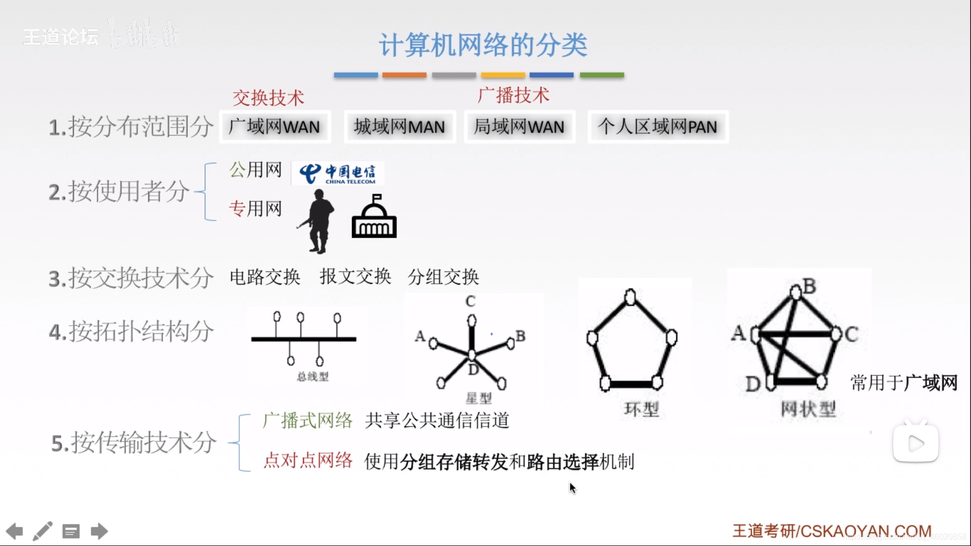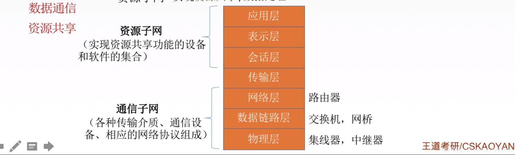 3.功能组成角度: ① 通信子网(实现数据通信)、②资源子网(实现资源共享/数据处理)
