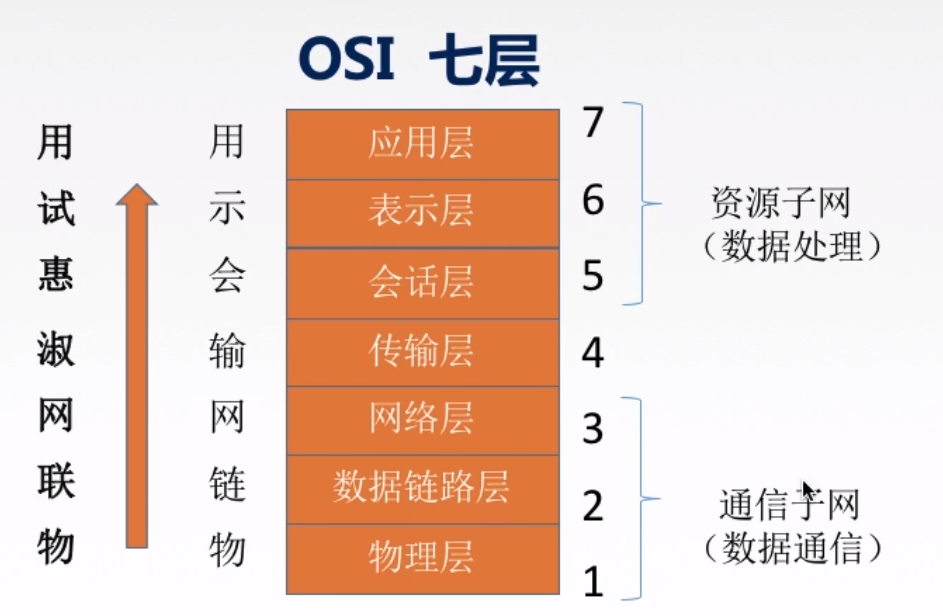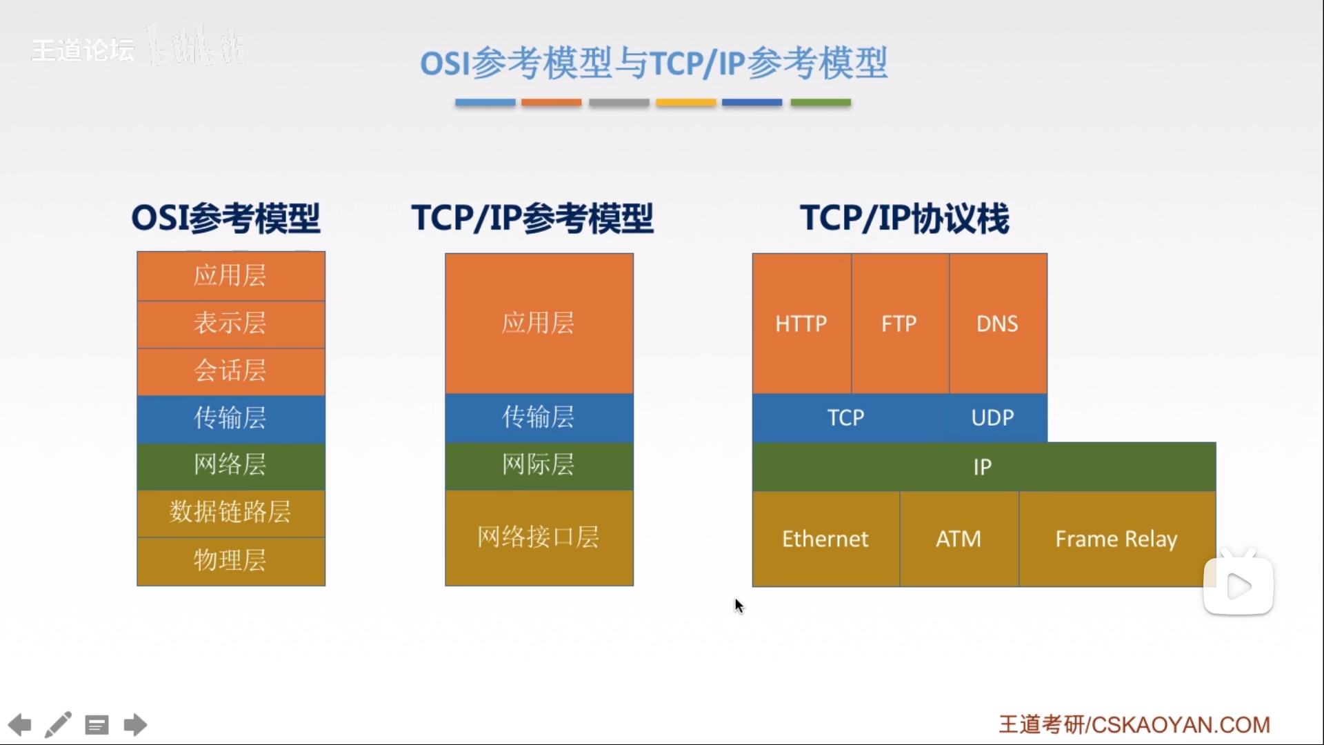 **应用层:**所有能和用户交互产生网络流量的程序。 典型应用层服务:文件传输(FTP);电子邮件(SMTP);万维网(HTTP) **表示层:**用于处理两通信系统中交换信息的表示方式。(语法和语义) 功能:①数据格式变换(翻译);②数据加密和解密;③数据压缩和恢复 **会话层:(建立同步)**像表示层实体/用户进程提供建立连接,并在连接上有序传输数据。 功能:①建立、管理、终止会话;②使用校验点,可使会话在通信失效时从校验点/同步点继续恢复通信,实现数据同步(适用于传大文件) **传输层:**负责主机中两个进程的通信,即端到端的通信,传输单位是报文段或用户数据报 功能:①可靠传输,不可靠传输;②差错控制;③流量控制(控制发送方的速度);④复用分用 **网络层:**主要任务是把分组从源端传到目的端,为分组交换网上的不同主机提供提供通信服务。(传输单位:数据报)(数据报和分组类似于父与子的关系) 功能:①路由选择;②流量控制;③差错控制;④拥塞控制(控制全局的传输速度) **数据链路层:**主要任务是把网络层传下来的数据组装成帧。(传输单位:帧) 功能:①成帧(定义帧的开始和结束);②差错控制(位错+帧错);③流量控制 ;④访问(接入)控制 (控制对信道的访问) **物理层:**主要任务是在物理媒体上实现比特流的透明传输。(单位:比特) 功能:①定义接口特性;②定义传输模式(单工、半双工、双工);③定义传输速率;④比特同步;⑤比特编码