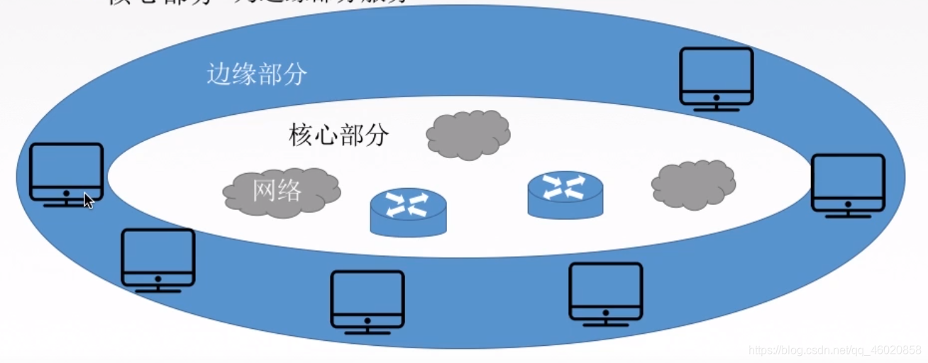 - 工作方式角度: ① 边缘部分(用户直接使用)、② 核心部分(为边缘部分服务,包括网络、路由器等)