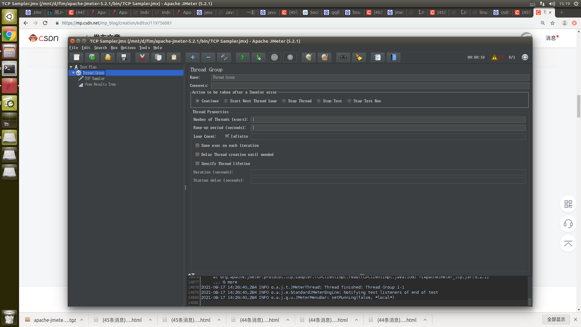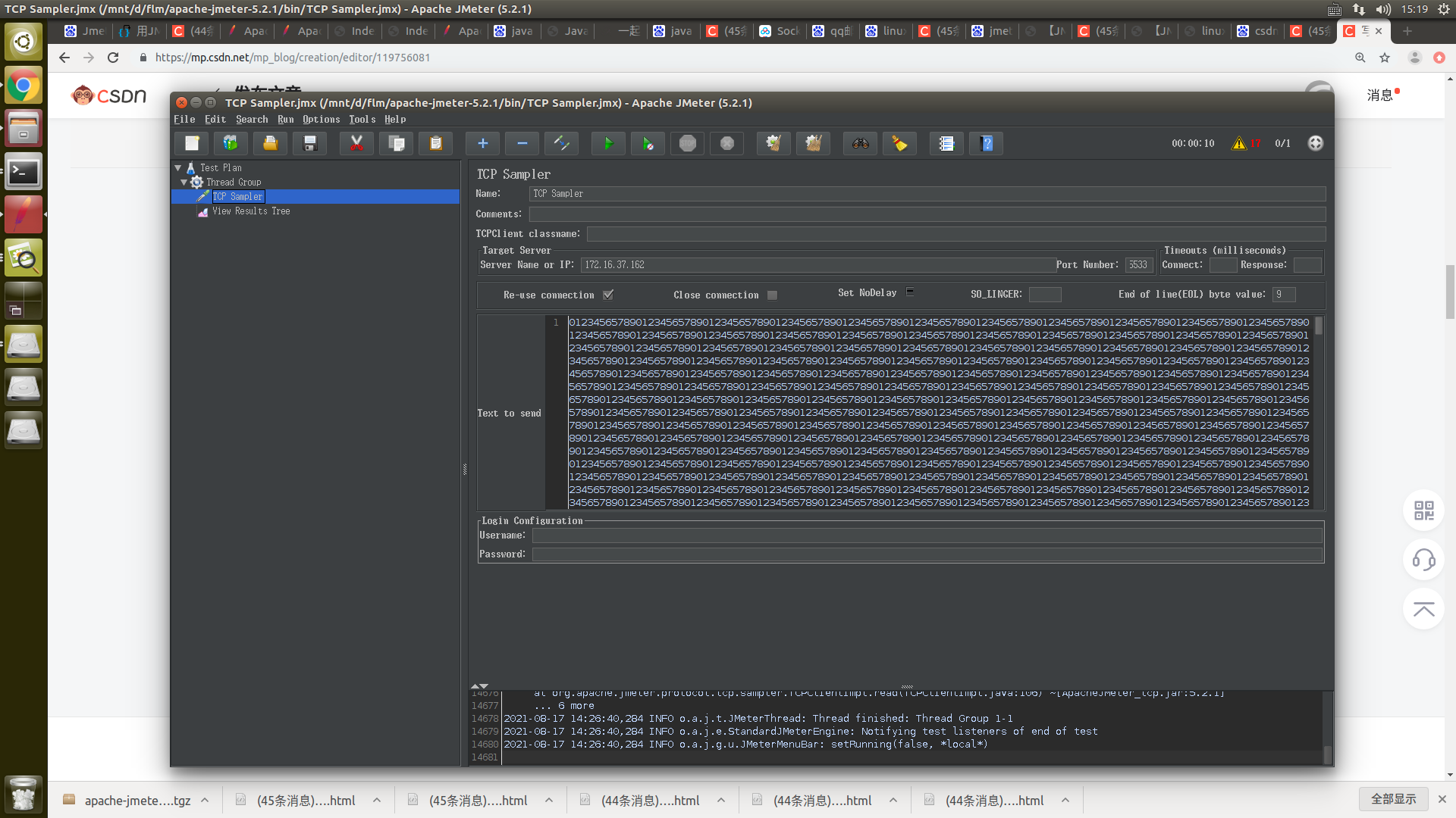 ?设置eolvalue=9,十进制,当tcp sampler 接收到服务器回复字节9的时候,开启下一次循环。发送21,539 字节。