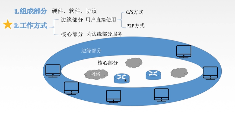 边缘部分:由所有连接在因特网的主机组成,是用户直接使用的,用来通信和资源共享的设备。 核心部分:由大量网络和连接这些网络的路由器组成,这部分是为边缘服务提供服务的。