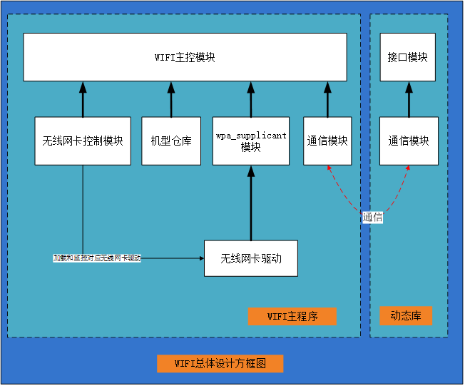 WIFI主控流程:为单独的动态库,由通信管理模块调用,其直接控制WIFI的主流程和负责wpa_supplicant交互。