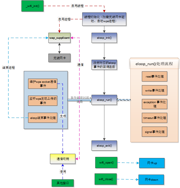 WIFI主控模块初始化时靠执行wifi_init()接口(由通信管理程序执行)来触发,libwifi.so会执行如下步骤: ? 初始化系统参数。 ? 获取平台和模块参数。 ? 根据平台和模块参数,加载无线网卡驱动。 ? 生成wpa_supplicant配置文件。 ? 启动wpa_supplicant进程。 ? 初始化eloop处理框架。 ? 注册对应需要执行的eloop事件回调函数。 ? 执行eloop_run()循环,处理异步事件。 当wpa_supplicant进程运行后,会通过wext接口控制无线网卡。此时在eloop初始化时注册的timeout回调函数会让libwifi和wpa_supplicant之间建立起一条内部socket通信,并生成一条与wpa_supplicant的通信句柄,并实时维护此通信的句柄,当该通信句柄断开后马上执行重连。 而应用执行其他接口,则都是通过此通信句柄来控制wpa_supplicant实现的,具体包含如下命令: ? “SCAN”:扫描热点。 ? “SCAN_RESULTS”:获取热点扫描结果。 ? “STATUS”:获取wpa_supplicant当前状态。 ? “LIST_NETWORKS”:列出连接网络状态和参数。 ? “REMOVE_NETWORK”:删除已有的网络连接。 ? “ADD_NETWORK”:增加新的网络连接。 ? “SET_NETWORK”:设置网络连接的对应参数,如ssid、psk等参数。 ? “SAVE_CONFIG”:保存网络设置参数。 ? “SELECT_NETWORK”:选择指定的网络连接。 ? “ENABLE_NETWORK”:使能指定的网络连接,让wpa_supplicant去连接该热点。 ? “DISCONNECT”:断开已连接的热点。 ? “SIGNAL_POLL”:获取已连接网络热点的信号强度。 ? “RECONNECT”:重连已有的网络热点。 当应用执行wifi_close ()接口时,libwifi.so会执行如下步骤: ? 发送信号给eloop框架,使退出eloop_run(),并释放对应的资源。 ? 发送断开热点连接。 ? 关闭wpa_supplicant进程。 ? 关闭dhcp进程。 ? 关闭无线网卡,并卸载对应驱动。 ? 退出WIFI主控线程,释放对应资源。 2.4.2.6.2. eloop框架