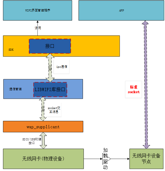 2.4. 软件设计方案 2.4.1. WIFI驱动框架结构 的驱动架构比较特殊,他需要用到开源软件 WIFI驱动模块是通过加载对应无线网卡的驱动,来实现无线网卡的初始化。此时在系统中会生成对应的无线网卡设备节点。后续驱动通过开源软件wap_supplicant来实现无线网络热点的扫描与连接。当连接上对应热点后,系统就可以通过对应无线网卡设备节点来实现标准的socket通信,下图示为WIFI驱动在系统中的架构示意图: