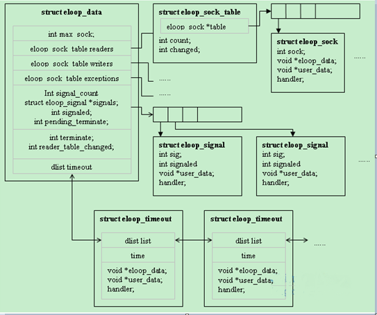 以下列出这些结构体的关系图:  struct eloop_data结构体是一个统领全局的数据结构,只有一个实例: //创建了一个静态全局变量,类型为eloop_data static struct eloop_data eloop; 这个变量会处理三大类型的Event事件: