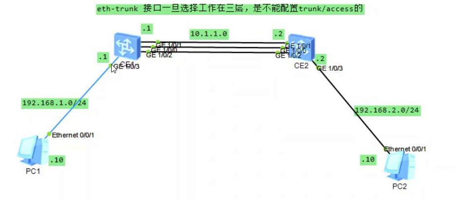 3.1创建三层链路聚合  3.2划分接口  3.3进入接口并划分 3.4添加IP地址并开启接口  3.5查看 eth-trunk表  3.6开启接口并保存  3.7配置PC1、PC2 PC1  PC2  3.8PC1 ping 一下PC2测试是否连通