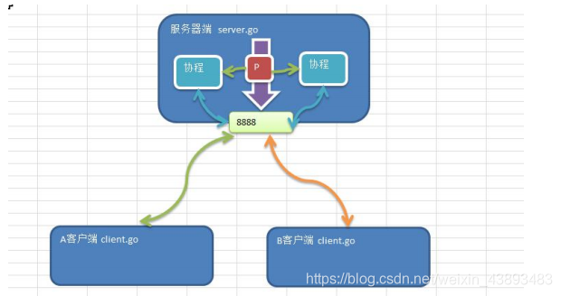 为了授课方便,我们将tcp socket编程,简称socket编程,下图为Golang socket编程中客户端和服务器的网络分布图: