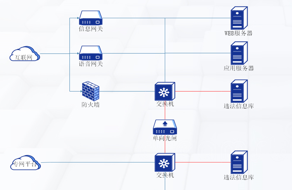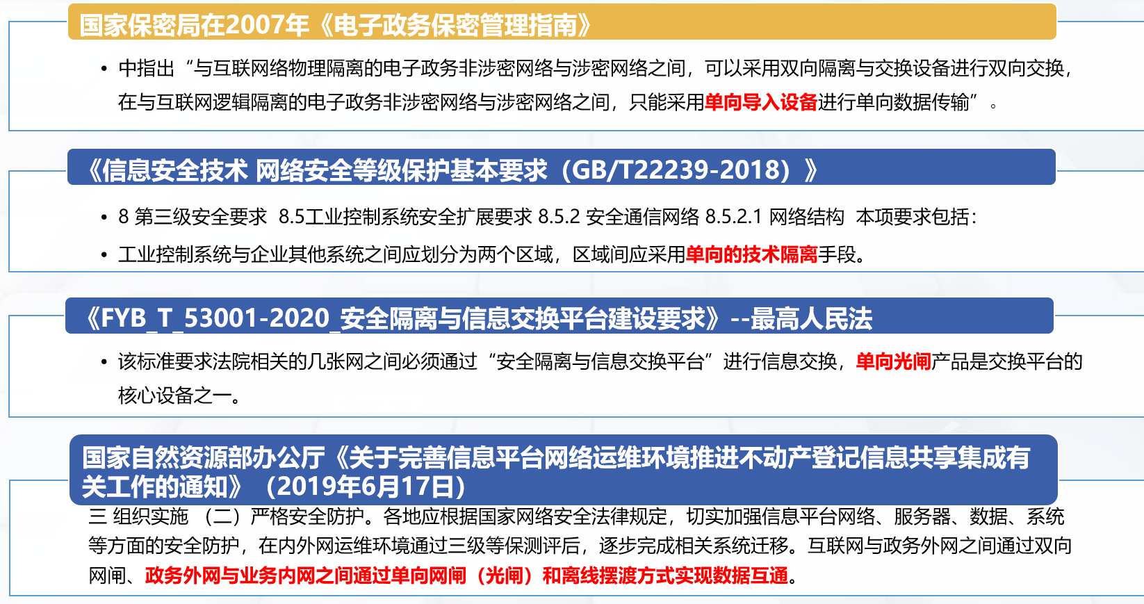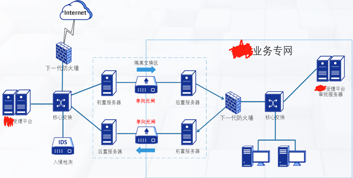 学名 安全隔离与信息单向导入系统:产品的认证证书中都是使用这个名称,源自此国家检测标准的产品名称定义。 别名 光闸:当前最常用的名称,这里的“光”是指光闸内部两主机之间使用光纤连接,与主机上是否有光口无关。 单向导入/单导(系统)/单向网闸 组成 基于双主机+光单向传输的硬件架构。主机之间只是通过外网主机光模块的一个发光器与内网主机光模块的一个收光器连接。 如:交换机多模模块、两条光纤一条发送、一条接收,光闸去掉其中一条、只能一头发一头收、物理上数据包打死回不来、收的一头肯定不能发送包到发送的一头; 作用 位于两个不同安全域之间,通过物理方式构造信息单向传输的唯一通道,实现信息单向导入,并且保证只有安全策略允许传输的信息可以通过,同时反方向无任何信息传输或反馈。 基于 TCP/UDP应用单向传输,传输类型分为TCP、UDP、DBSYNC、DTCP(双设备TCP )、DDBSYNC(双设备DB同步)五种 控制应用层指令,如指定用户名、邮件地址;可以对邮件正文、附件格式等进行指定过滤 如:RTMP、RTSP、SIP协议进行视频推流,与同品牌设备联动。 ASM、SSM、SFM多种组播方式、组播代理 目前市面部分支持SMB、FTP、常见数据库同步