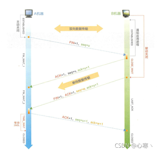 ????????TCP是全双工通信,双方都能作为数据的发送方和接收方,但TCP连接也会有断开的时候。所谓相爱容易分手难,建立连接只有三次,而挥手断开则需要四次,如图1-23所示。A机器想要关闭连接,则待本方数据发送完毕后,传递FIN信号给B机器。B机器应答ACK,告诉A机器可以断开,但是需要等B机器处理完数据,再主动给A机器发送FIN信号。这时,A机器处于半关闭状态(FIN_WAIT_2 ),无法再发送新的数据。B机器做好连接关闭前的准备工作后,发送FIN给A机器,此时B机器也进入半关闭状态(CLOSE_WAIT)。A机器发送针对B机器FIN的ACK后,进入TIME-WAIT状态,经过2MSL ( Maximum Segment Lifetime )后,没有收到B机器传来的报文,则确定B机器已经收到A机器最后发送的ACK指令,此时TCP连接正式释放。具体释放步骤如图所示: