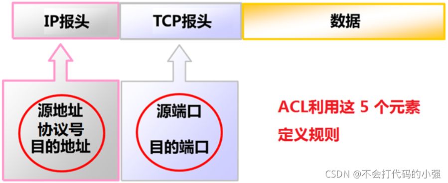 ?ACL根据IP报头中的源地址、协议号、目标地址和TCP报头中的源端口、目标端口这5个元素来定义规则