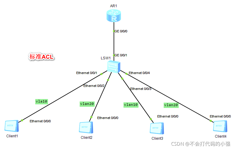 Client1:IP:192.168.10.10/24 网关:192.168.10.1 设置IP地址为192.168.10.10,子网掩码长度为24,网关为192.168.10.1 Client2:IP:192.168.20.10/24 ?网关:192.168.20.1 设置IP地址为192.168.20.10,子网掩码长度为24,网关为192.168.20.1 Client3:IP:192.168.10.20/24 网关:192.168.10.1 设置IP地址为192.168.10.20,子网掩码长度为24,网关为192.168.10.1 Client4:IP:192.168.20.20/24 ?网关:192.168.20.1 设置IP地址为192.168.20.20,子网掩码长度为24,网关为192.168.20.1 二层交换 [ ]vlan bat 10 20 创建vlan 10 20 [ ]int e0/0/1 进入接口e0/0/1 [ ]port link-type access ?设置接口链路类型为access [ ]port default vlan 10 将接口划分进对应vlan10 [ ]int e0/0/2 进入接口e0/0/2 [ ]port link-type access 设置接口链路类型为access [ ]port default vlan 20 将接口划分进对应vlan20 [ ]int e0/0/3 进入接口e0/0/3 [ ]port link-type access 设置接口链路类型为access [ ]port default vlan 10 将接口划分进对应vlan10 [ ]int e0/0/4 进入接口e0/0/4 [ ]port link-type access 设置接口链路类型为access [ ]port default vlan 20 将接口划分进对应vlan20 [ ]int g0/0/1 进入接口g0/0/1 [ ]port link-type trunk 设置接口链路类型为trunk [ ]port trunk allow-pass vlan all 设置白名单 路由 [ ]int g0/0/0 进入接口g0/0/0 [ ]undo shut 打开接口 [ ]int g0/0/0.1 进入子接口g0/0/0.1 [ ]dot1q termination vid 10 封装方式为802.1q,将子接口划分进vlan10 [ ]ip add 192.168.10.1 24 设置ip地址,子网掩码长度为24 [ ]arp broadcast enable 开启arp广播功能 [ ]int g0/0/0.2 ?进入子接口g0/0/0.2 [ ]dot1q termination vid 20 封装方式为802.1q,将子接口划分进vlan10 [ ]ip add 192.168.20.1 24 设置ip地址,子网掩码长度为24 [ ]arp broadcast enable 开启arp广播功能 [ ]acl 2000 创建标准访问控制列表,列表号2000 [ ]rule deny source 192.168.10.0 0.0.0.255 拒绝192.168.10.10网段(子网掩码为反掩码) [ ]rule permit source any 放行其他路由条目 [ ]int g0/0/0.2 进入子接口g0/0/0.2 [ ]traffic-filter outbound acl 2000 选择在出接口上调用列表2000 验证: Client1pingClient2 失败 Client1pingClient3 失败 Client1pingClient4 失败