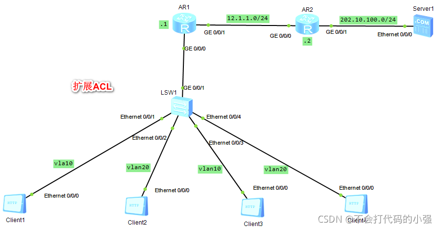 Client1:192.168.10.10/24 网关:192.168.10.1 设置IP地址为192.168.10.10,子网掩码长度为24,网关为192.168.10.1 Client2:192.168.20.10/24 ?网关:192.168.20.1 设置IP地址为192.168.20.10,子网掩码长度为24,网关为192.168.20.1 Client3:192.168.10.20/24 网关:192.168.10.1 设置IP地址为192.168.10.20,子网掩码长度为24,网关为192.168.10.1 Client4:192.168.20.20/24 ?网关:192.168.20.1 设置IP地址为192.168.20.20,子网掩码长度为24,网关为192.168.20.1 服务器:202.10.100.100/24 ?网关:202.10.100.2 设置IP地址为202.10.100.100,子网掩码长度为24,网关为202.10.100.2 设置FTPserver端口号21,并且开启 二层SW1: [ ]vlan bat 10 20创建vlan 10 20 [ ]int e0/0/1进入接口e0/0/1 [ ]port link-type access设置接口链路类型为access [ ]port default vlan 10将接口划分进对应vlan10 [ ]int e0/0/2进入接口e0/0/2 [ ]port link-type access设置接口链路类型为access [ ]port default vlan 20将接口划分进对应vlan20 [ ]int e0/0/3进入接口e0/0/3 [ ]port link-type access设置接口链路类型为access [ ]port default vlan 10将接口划分进对应vlan10 [ ]int e0/0/4进入接口e0/0/4 [ ]port link-type access设置接口链路类型为access [ ]port default vlan 20将接口划分进对应vlan20 [ ]int g0/0/1进入接口g0/0/1 [ ]port link-type trunk设置接口链路类型为trunk [ ]port trunk allow-pass vlan all设置白名单 R1: [ ]int g0/0/0进入接口g0/0/0 [ ]undo shut打开接口 [ ]int g0/0/0.1进入子接口g0/0/0.1 [ ]dot1q termination vid 10封装方式为802.1q,将子接口划分进vlan10 [ ]ip add 192.168.10.1 24设置ip地址,子网掩码长度为24 [ ]arp broadcast enable开启arp广播功能 [ ]int g0/0/0.2进入子接口g0/0/0.2 [ ]dot1q termination vid 20封装方式为802.1q,将子接口划分进vlan10 [ ]ip add 192.168.20.1 24设置ip地址,子网掩码长度为24 [ ]arp broadcast enable开启arp广播功能 [ ]int g0/0/1进入接口g0/0/1 [ ]ip add 12.1.1.1 24设置ip地址,子网掩码长度为24 [ ]undo shut打开接口 [ ]ip route-static 0.0.0.0 0 12.1.1.2设置静态路由,目的网段0.0.0.0子网掩码长度为0,下一跳入接口IP12.1.1.2 [ ]acl 3000创建访问控制列表,列表号3000 [ ]rule deny tcp source 192.168.10.10 0 destination 202.10.100.100 0 destination-port eq 21禁止PC1访问FTP服务 [ ]rule permit tcp source any destination any destination-port eq 21放行其他客户机访问FTP [ ]rule permit ip source any destination any放行其他客户机的网络流量 [ ]int g0/0/0.1进入子接口g0/0/0.1 [ ]traffic-filter inbound acl 3000选择在入接口上调用列表3000 R2: [ ]int g0/0/0进入接口g0/0/0 [ ]ip add 12.1.1.2 24设置ip地址,子网掩码长度为24 [ ]undo shut打开接口 [ ]int g0/0/1进入接口g0/0/1 [ ]ip add 202.10.100.2 24设置ip地址,子网掩码长度为24 [ ]undo shut打开接口 [ ]ip route-static 0.0.0.0 0 12.1.1.1设置静态路由,目的网段0.0.0.0子网掩码长度为0,下一跳入接口IP12.1.1.1 服务器 开启FTP服务 验证: Client1登录服务器 失败 Client2登录服务器 成功 Client3登录服务器 成功 Client4登录服务器 成功