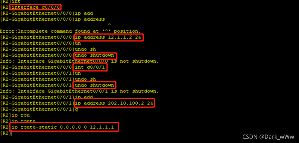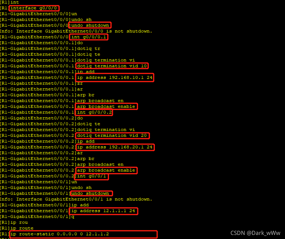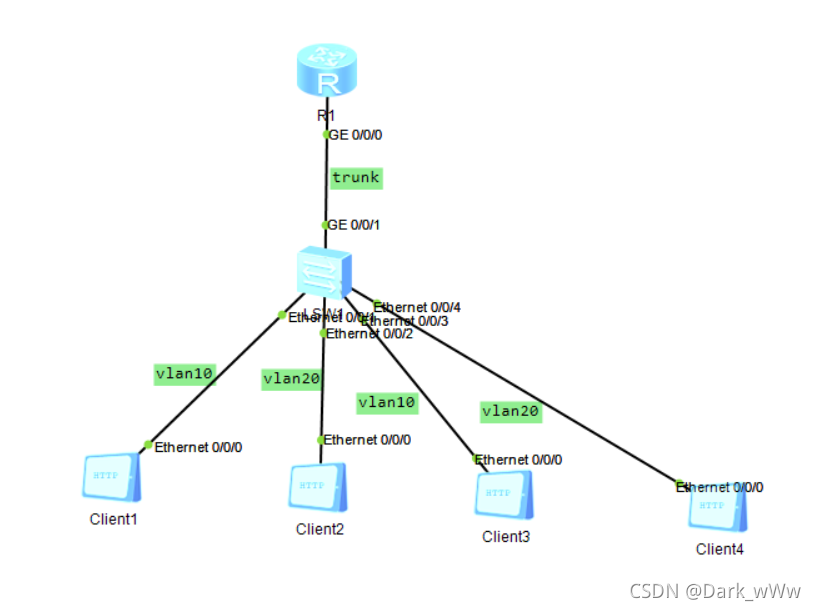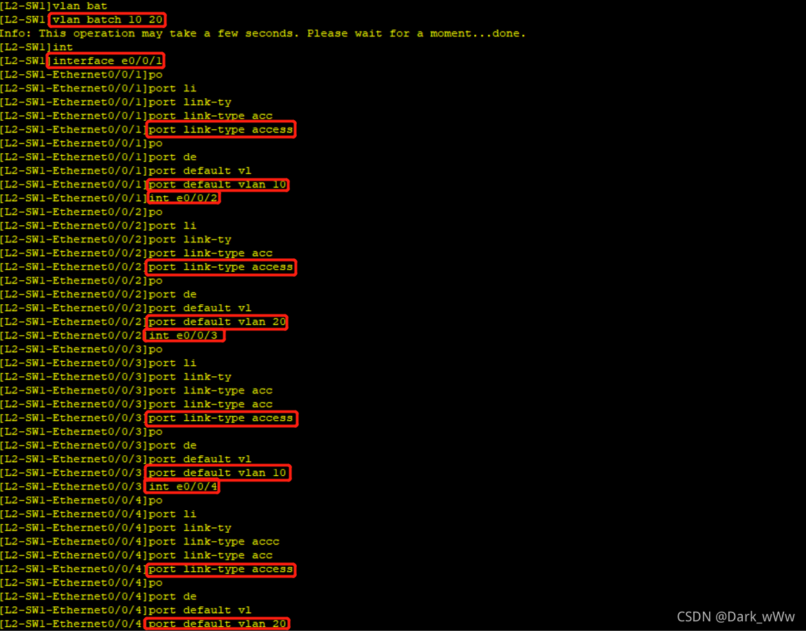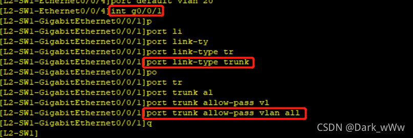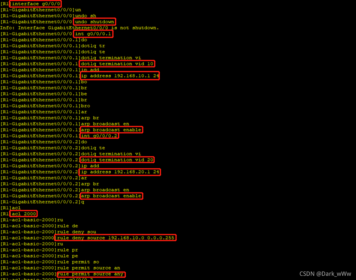 L2-SW1 []vlan batch 10 20 ? //创建vlan10 20 []interface e0/0/1 ? //进入接口e0/0/1 []port link-type access ? //设置接口类型为access? []port default vlan 10 ? //接口划分进vlan10 []interface e0/0/2 ? //进入接口e0/0/2 []port link-type access ? //设置接口类型为access? []port default vlan 20 ? //接口划分进vlan20 []interface e0/0/3 ? //进入接口e0/0/3 []port link-type access ? //设置接口类型为access? []port default vlan 10 ? //接口划分进vlan10 []interface e0/0/4 ? //进入接口e0/0/4 []port link-type access ? //设置接口类型为access? []port default vlan 20 ? //接口划分进vlan20 []interface g0/0/1 ? //进入接口g0/0/1 []port link-type trunk ? ?//设置接口类型为trunk []port trunk allow-pass vlan all ? //设置白名单 R1 []interface g0/0/0 ? //进入接口g0/0/0? []undo shutdown ? //开启接口g0/0/0? []interface g0/0/0.1 ? //进入子接口g0/0/0.1 []dot1q termination vid 10 ? //子接口g0/0/0.1封装进vlan10 []ip address 192.168.10.1 24 ? //设置IP地址和子网掩码长度为24 []arp broadcast enable ? ?//开启ARP广播功能 []interface g0/0/0.2 ? //进入子接口g0/0/0.2 []dot1q termination vid 20 ? //子接口g0/0/0.2封装进vlan20 []ip address 192.168.20.1 24 ? //设置IP地址和子网掩码长度为24 []arp broadcast enable ? ?//开启ARP广播功能 []acl number 2000 ? //创建标准访问列表 2000 []rule deny source 192.168.10.0 0.0.0.255 ? //设置拒绝访问192.168.10.0网段和反掩码 []rule permit source any ? //放行其它路由条目 []interface g0/0/0.2 ? //进入子接口g0/0/0.2 []traffic-filter outbound acl 2000 ? //选择在出接口上调用列表2000