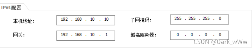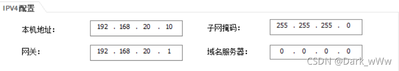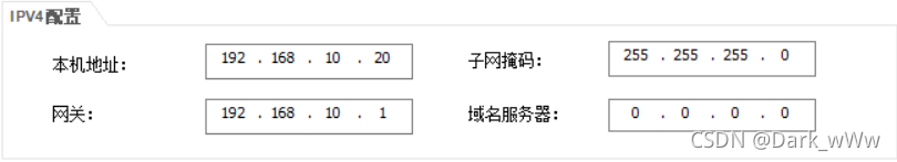 PC1 IP:192.168.10.10 子网掩码:255.255.255.0 网关:192.168.10.1 PC2 IP:192.168.20.10 子网掩码:255.255.255.0 网关:192.168.20.1 PC3 IP:192.168.10.20 子网掩码:255.255.255.0 网关:192.168.10.1 PC4 IP:192.168.20.20 子网掩码:255.255.255.0 网关:192.168.20.1