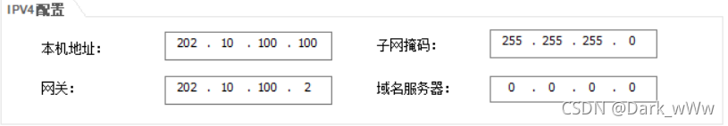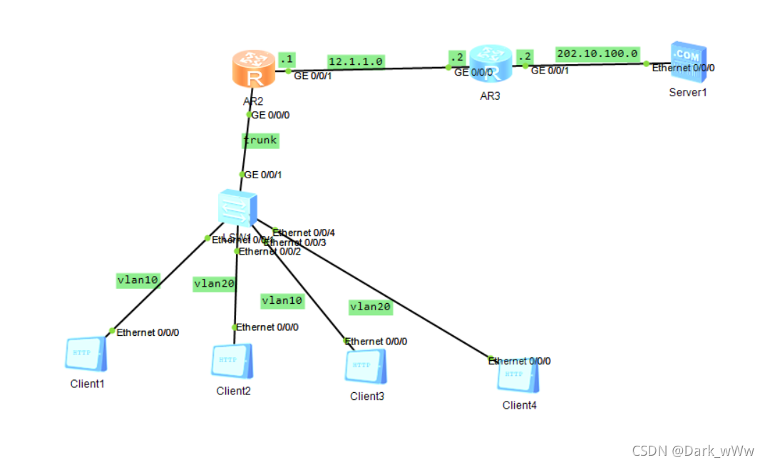 PC1 IP:192.168.10.10 子网掩码:255.255.255.0 网关:192.168.10.1 PC2 IP:192.168.20.10 子网掩码:255.255.255.0 网关:192.168.20.1 PC3 IP:192.168.10.20 子网掩码:255.255.255.0 网关:192.168.10.1 PC4 IP:192.168.20.20 子网掩码:255.255.255.0 网关:192.168.20.1 服务器 IP:202.10.100.100 子网掩码:255.255.255.0 网关:202.10.100.2
