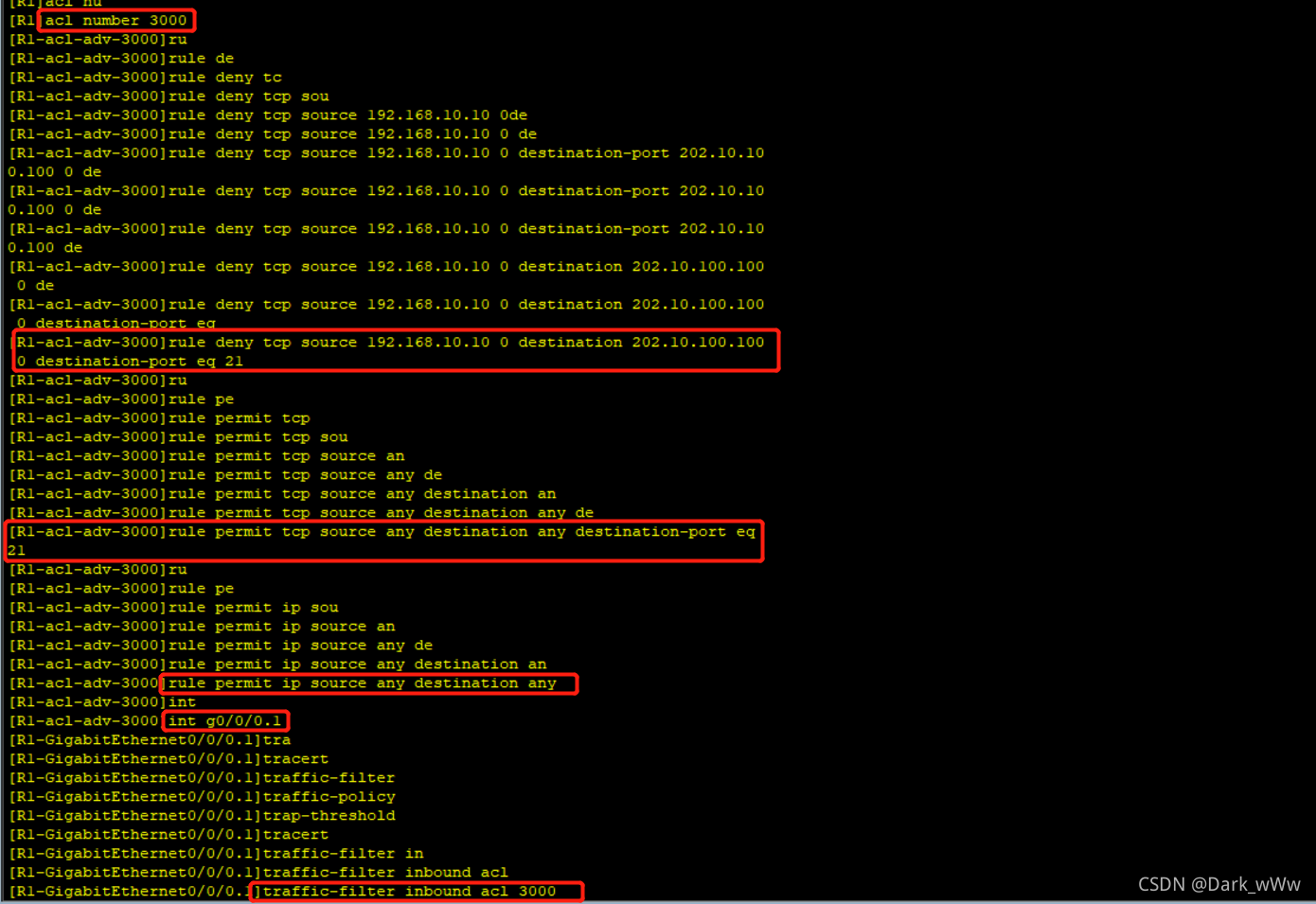扩展访问控制列表 可以基于源IP地址,目的IP地址,TCP/UDP协议,目标端口号过滤数据包 扩展访问控制列表的访问控制列表号是3000-3999 相比较标准访问控制列表,流量控制的更加精确 调用原则:靠近源