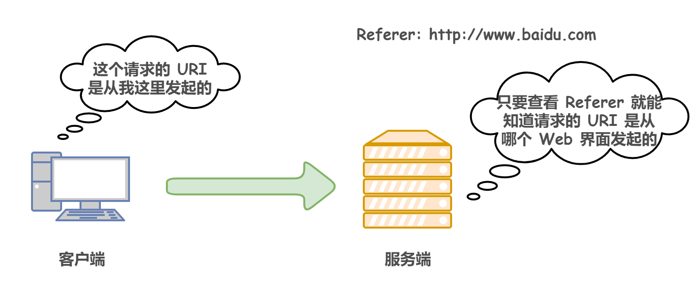 请求头用于补充请求的附加信息,比如说客户端信息,对响应内容相关的优先级等内容。以下列出常见请求头: 1)Referer:告知服务器这个请求是从哪个URI跳转过来的(就好像链路层的路由一样),如果是直接从客户端发起的请求就不会包含这个字段。  **2)Accept:**告诉服务端,这个请求支持的响应数据类型,就比如说我发起一个请求报文支持图片返回,服务端如果响应的是视频类型就不行。 (响应报文头里也包含一个字段Content-Type,表示响应的数据类型,如果Content-Type和Accept里的值不对应,就会报错)